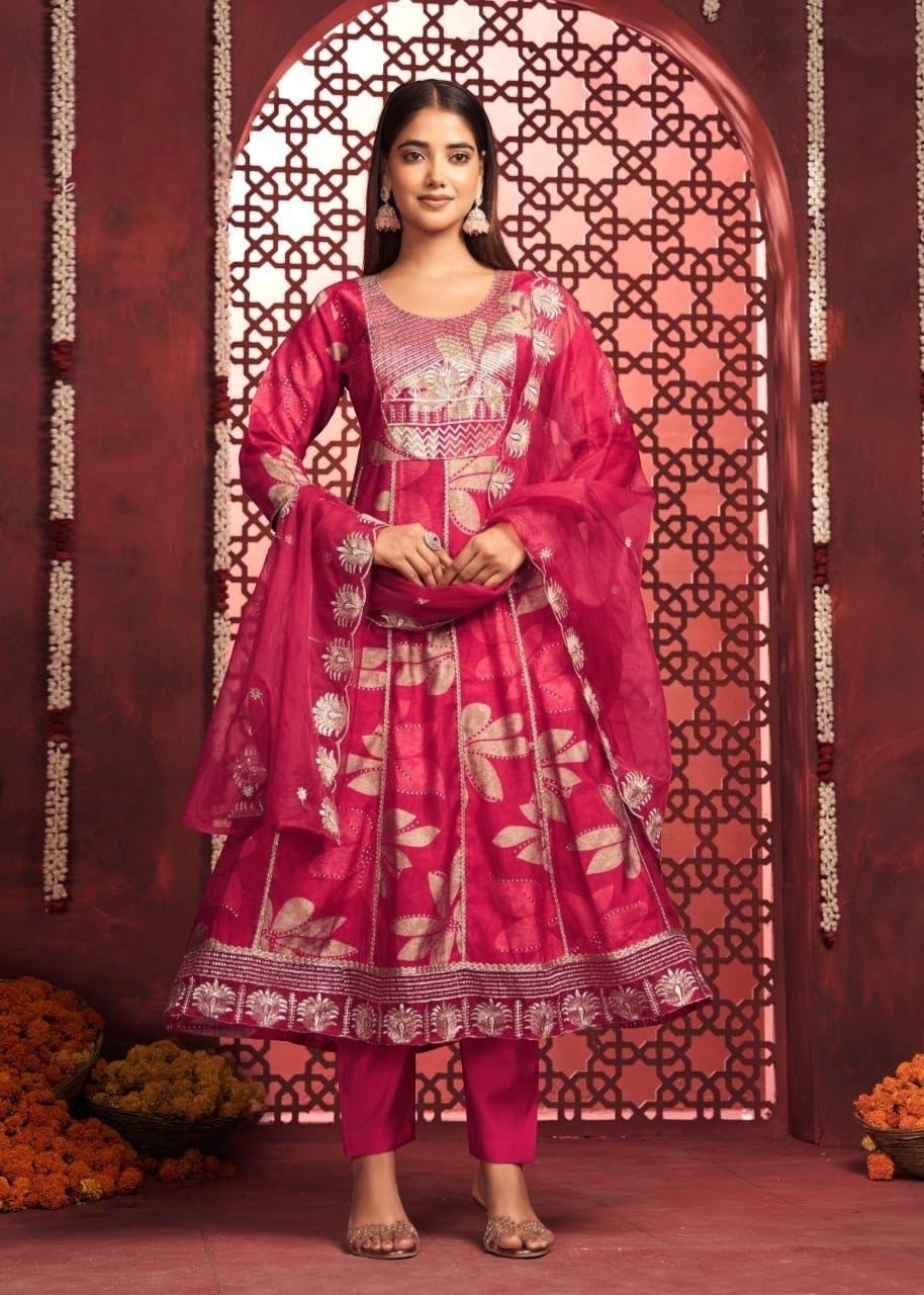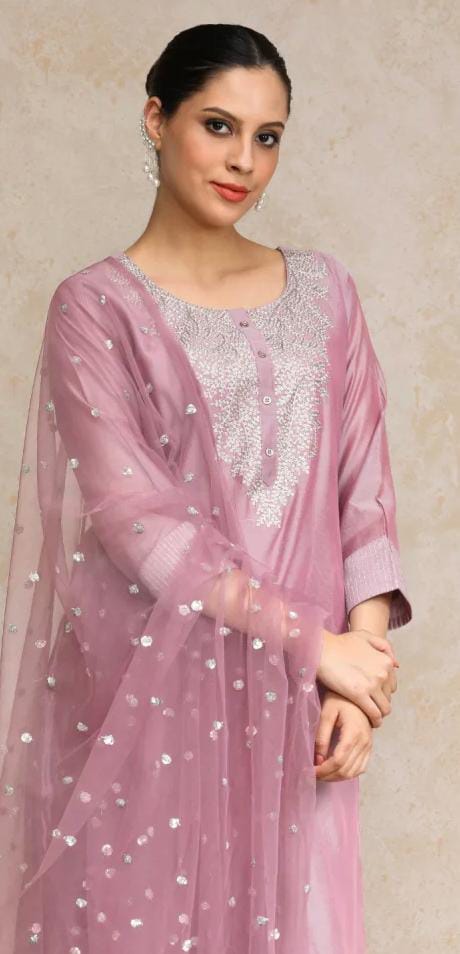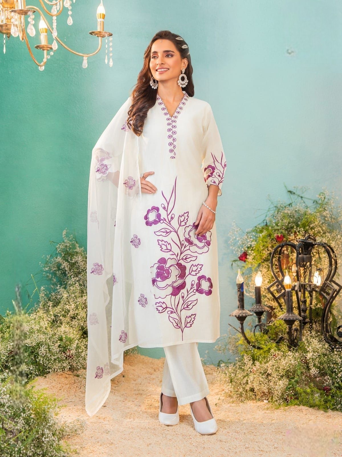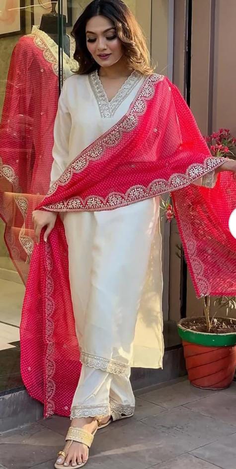 White Pure Silk Kurta Paired with Hot Pink Bande...