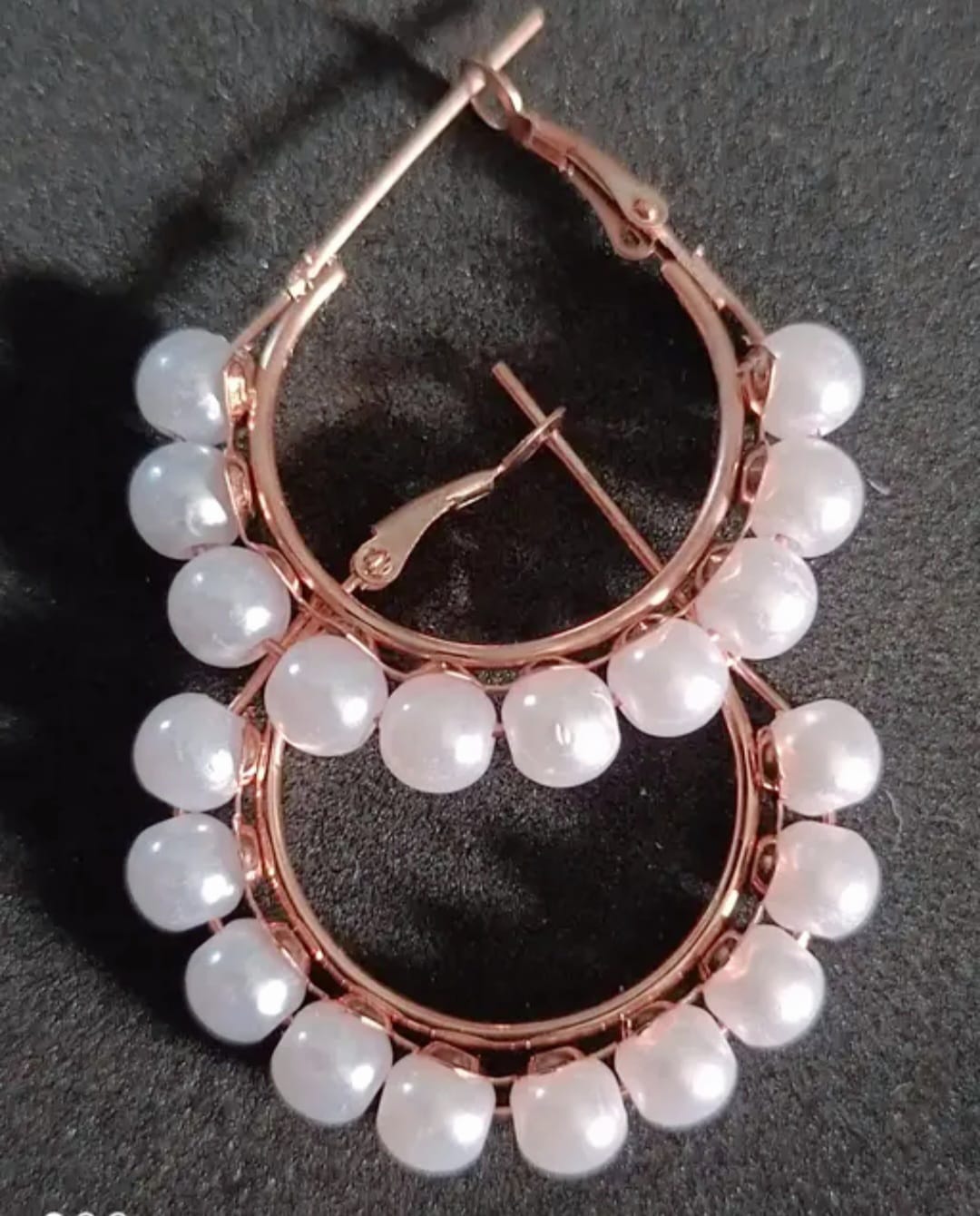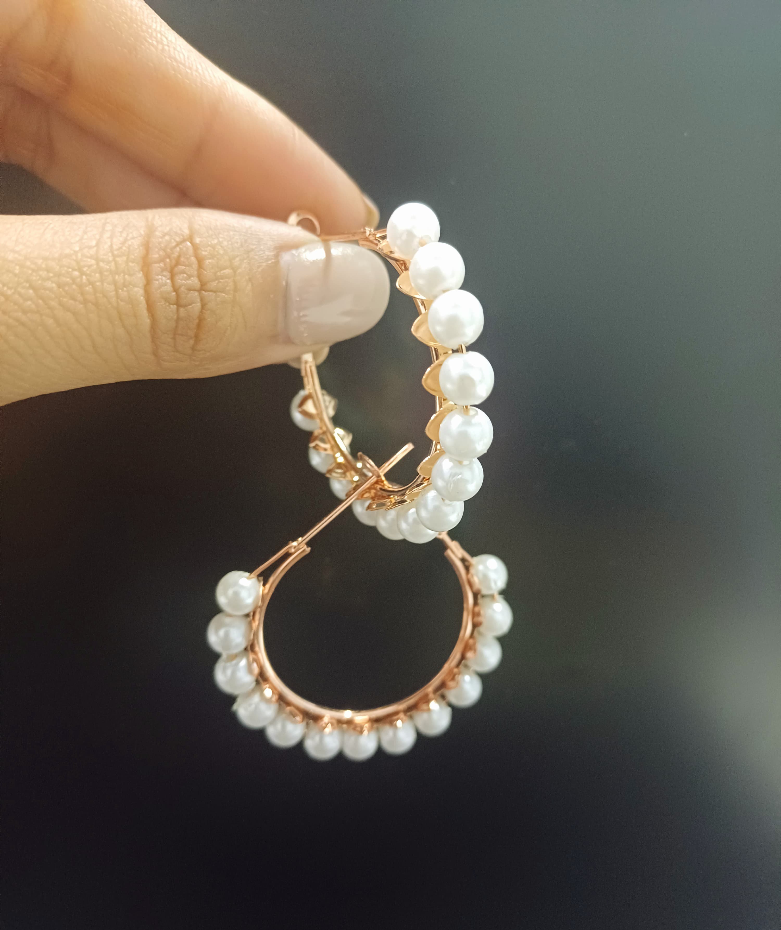Beautifully crafted rose gold hoop earrings are accented with a circle of lustrous pearls, creating a luxurious and elegant accessory for any occasion. The secure latch-back closure ensures a comfortable fit, while the double-layered design adds a unique, modern flair. Perfect for weddings, formal events, or adding a touch of class to your everyday ensemble.