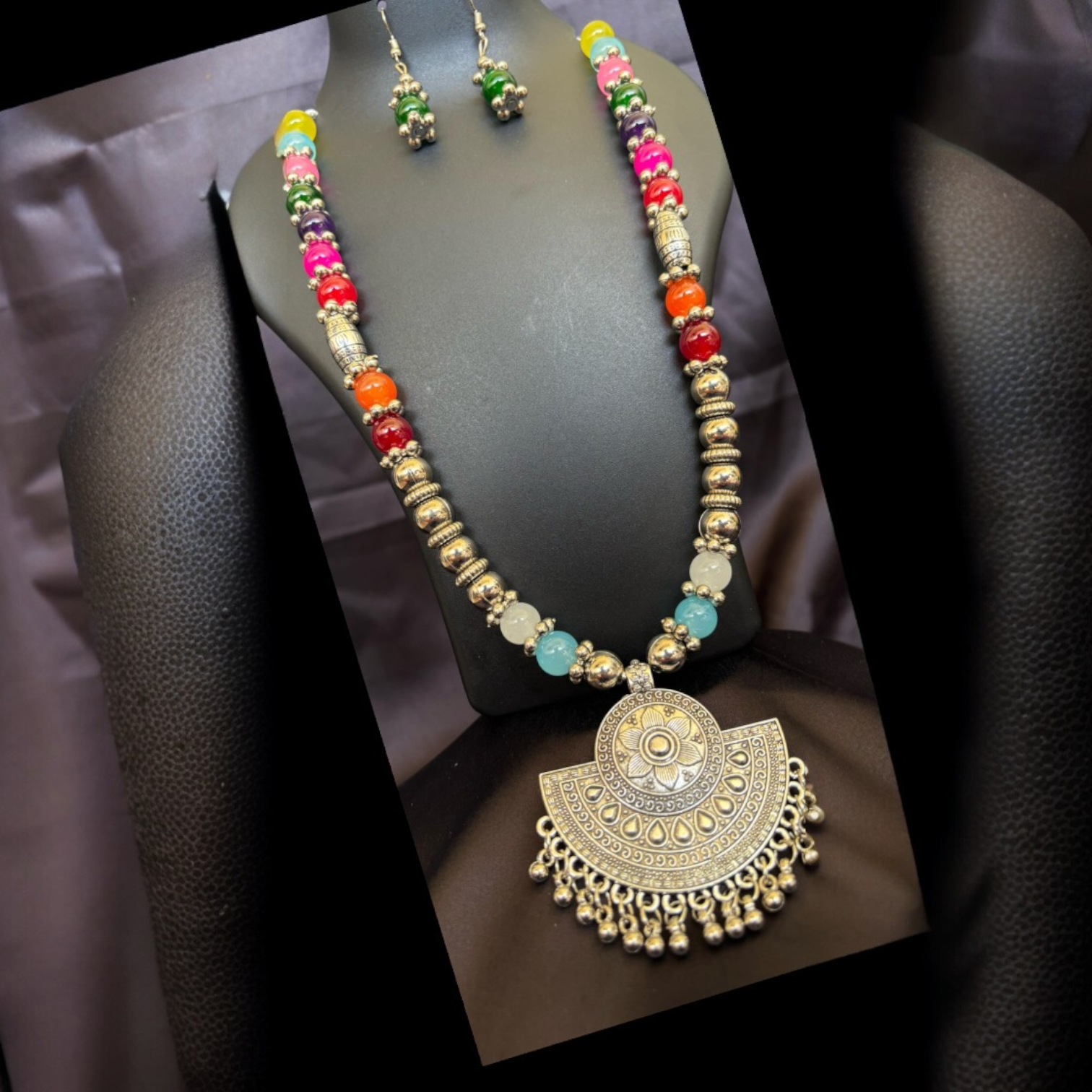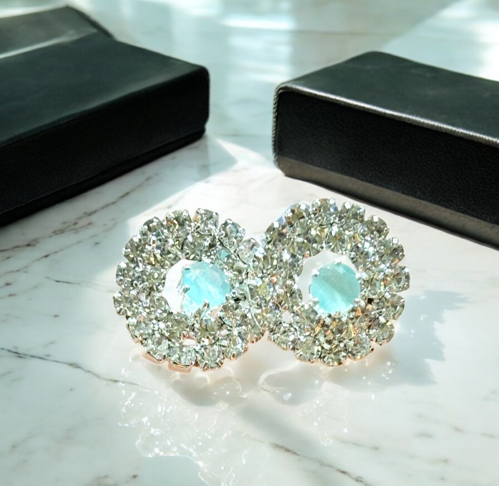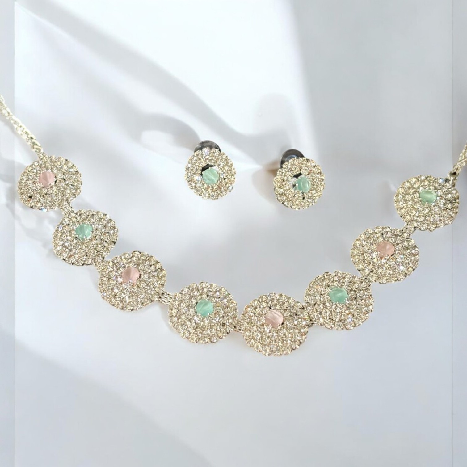 Elevate your ensemble with this enchanting Pastel Mosaic Crystal Medallion Set. Nine intricately crafted circular medallions—each edged in sparkling clear crystals—are linked to form a statement necklace. The centers alternate between soft rose‑quartz‑tone and cool mint‑green glass stones, lending a delicate, multidimensional palette. Completing the set are coordinating stud earrings that mirror the medallion design for a cohesive, head‑to‑toe sparkle.