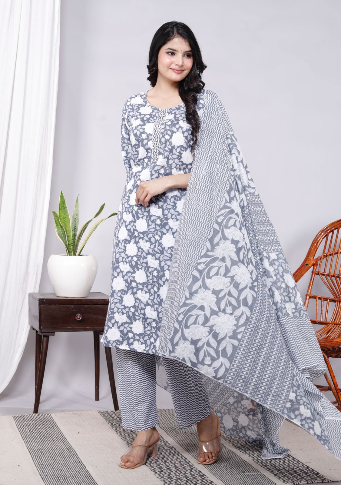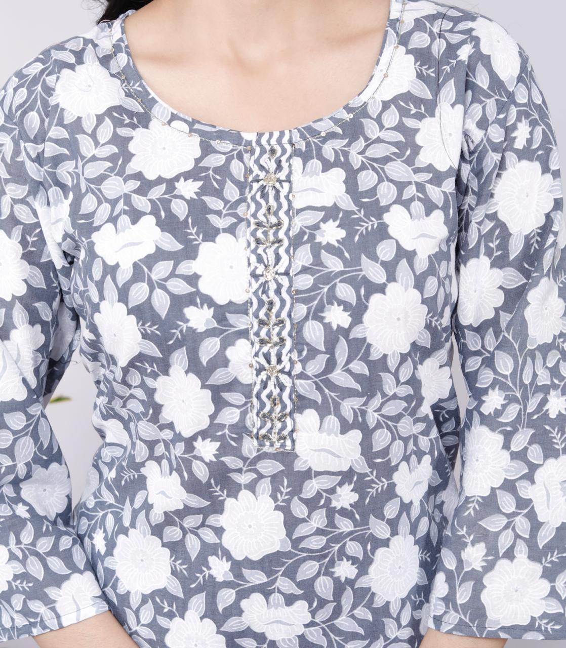 Add elegance to your casual wear with this grey floral print kurta, crafted from 100% pure cotton. The breathable fabric ensures all-day comfort, while the floral pattern adds a touch of charm. Easy to care for with its machine-washable weave, this kurta is available in sizes M to XXL, making it a perfect fit for any wardrobe.