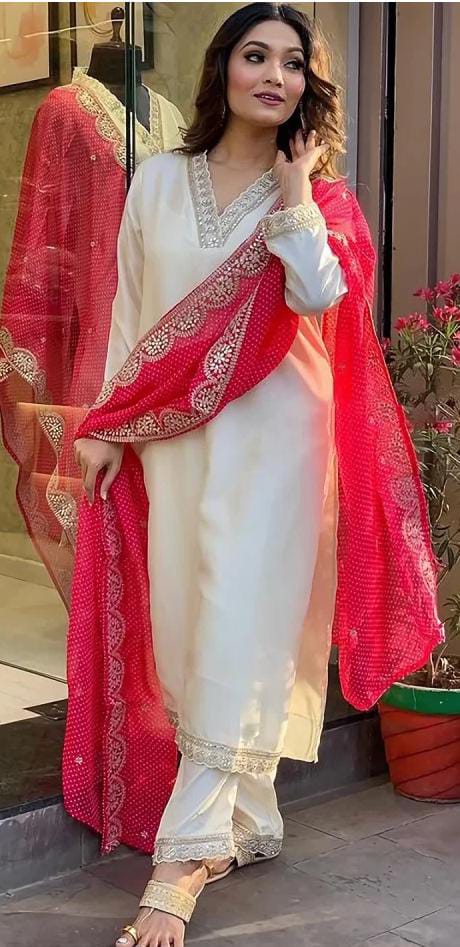 This elegant white pure silk kurta, paired with a vibrant hot pink bandej print dupatta, offers a blend of classic style and modern charm. The machine-washable fabric ensures convenience without compromising on quality. Available in sizes M to XXL, this piece is perfect for both casual and festive occasions.