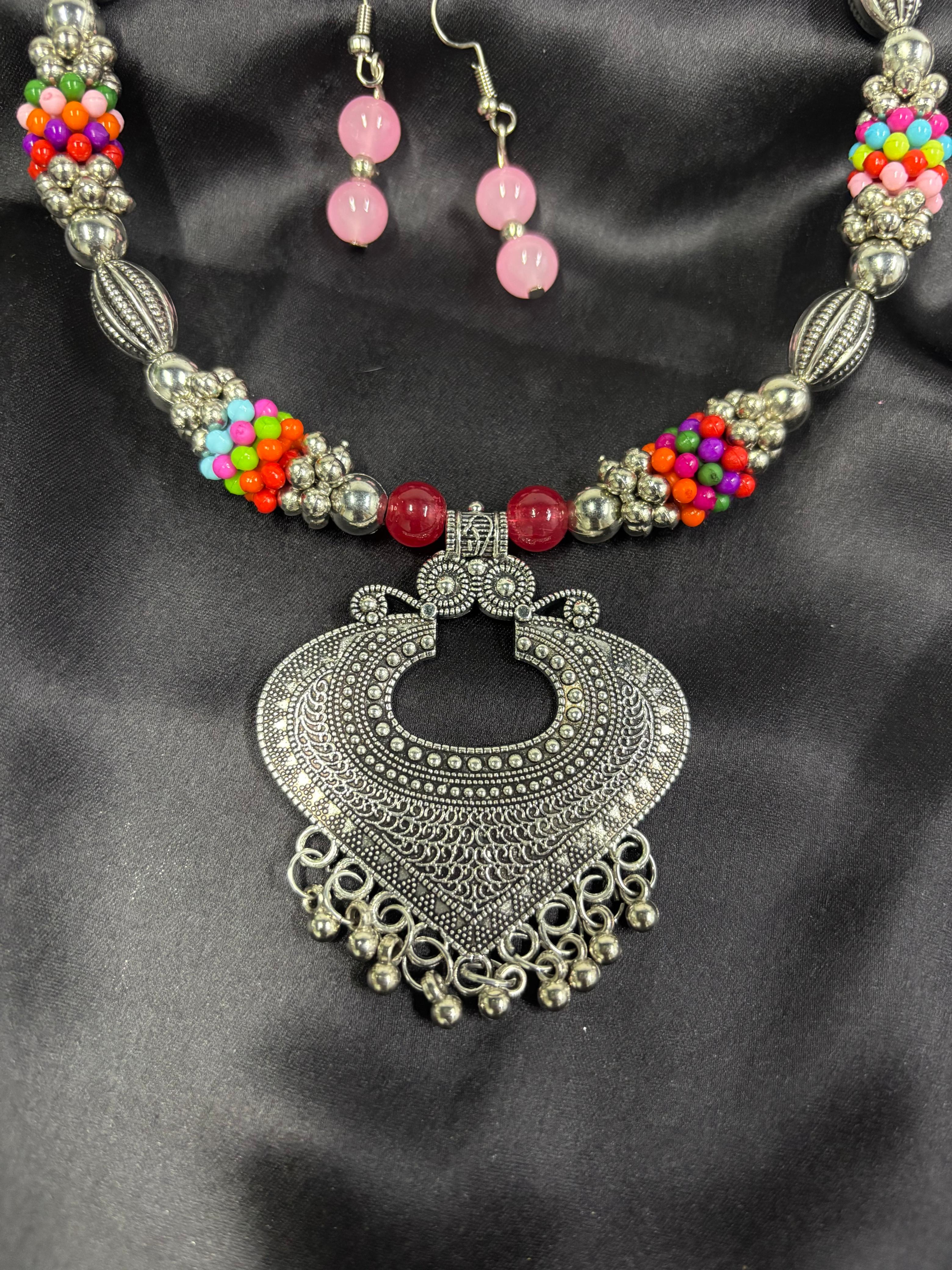 Bohemian Silver Tribal Necklace is a stunning blend of elegance and vibrant artistry. It features a large intricately carved silver pendant that adds a regal touch to your ensemble. The necklace is adorned with colorful beads, metallic accents, and detailed patterns, giving it a lively and eye-catching appeal. The accompanying matching pink bead earrings complete the set, making it a perfect accessory for festive occasions, ethnic outfits, and casual bohemian styles. Whether paired with a saree, lehenga, or a casual fusion outfit, this necklace set effortlessly enhances your look.