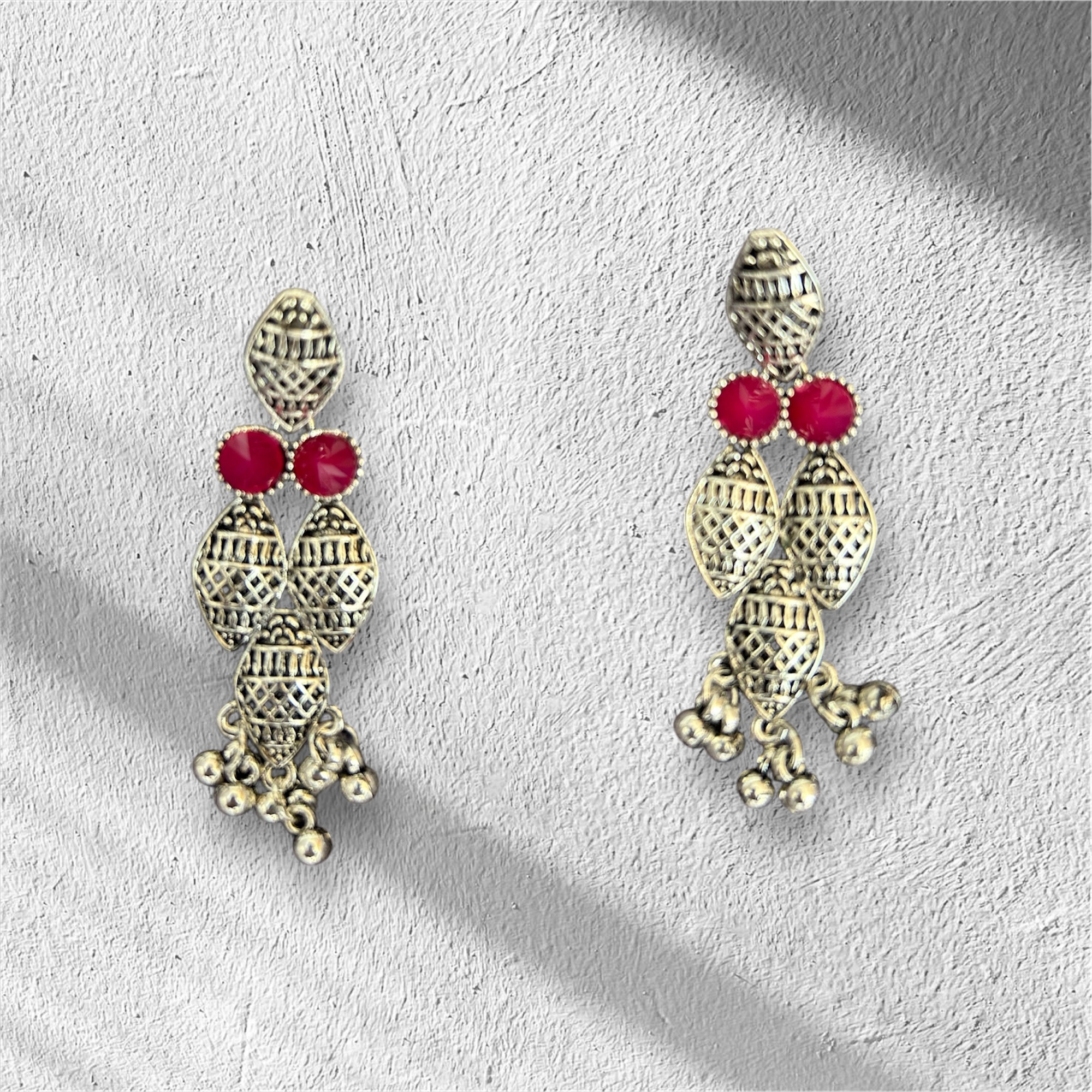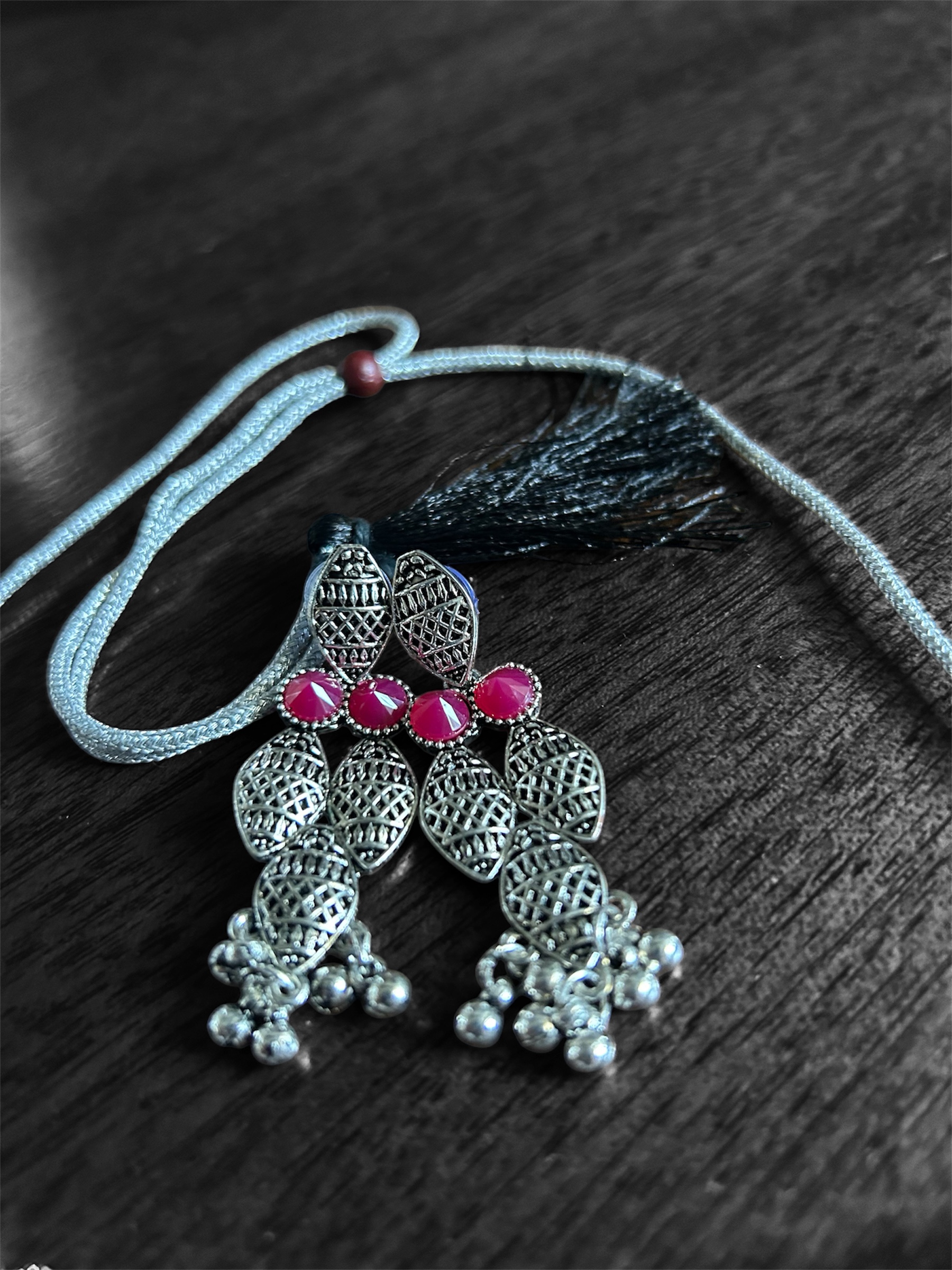 This exquisite oxidized silver jewelry set includes a stunning necklace and matching earrings. The necklace features intricately detailed motifs and is embellished with vibrant multicolor stones, adding a pop of color to its antique finish. The dangling silver beads add elegance, making it perfect for festive occasions, weddings, and cultural celebrations. The earrings complement the necklace with a similar detailed pattern and colorful embellishments, creating a harmonious and stylish look.
