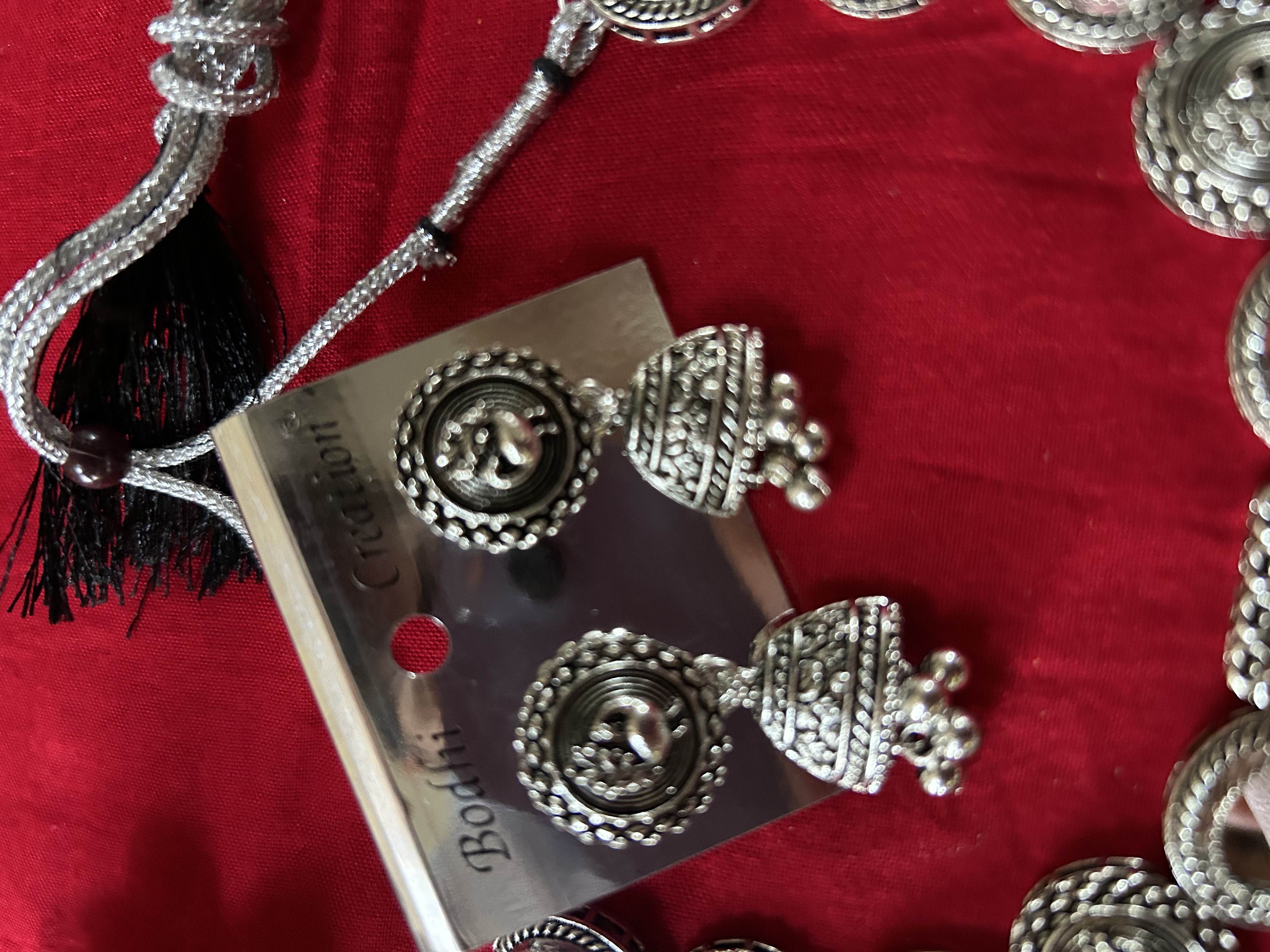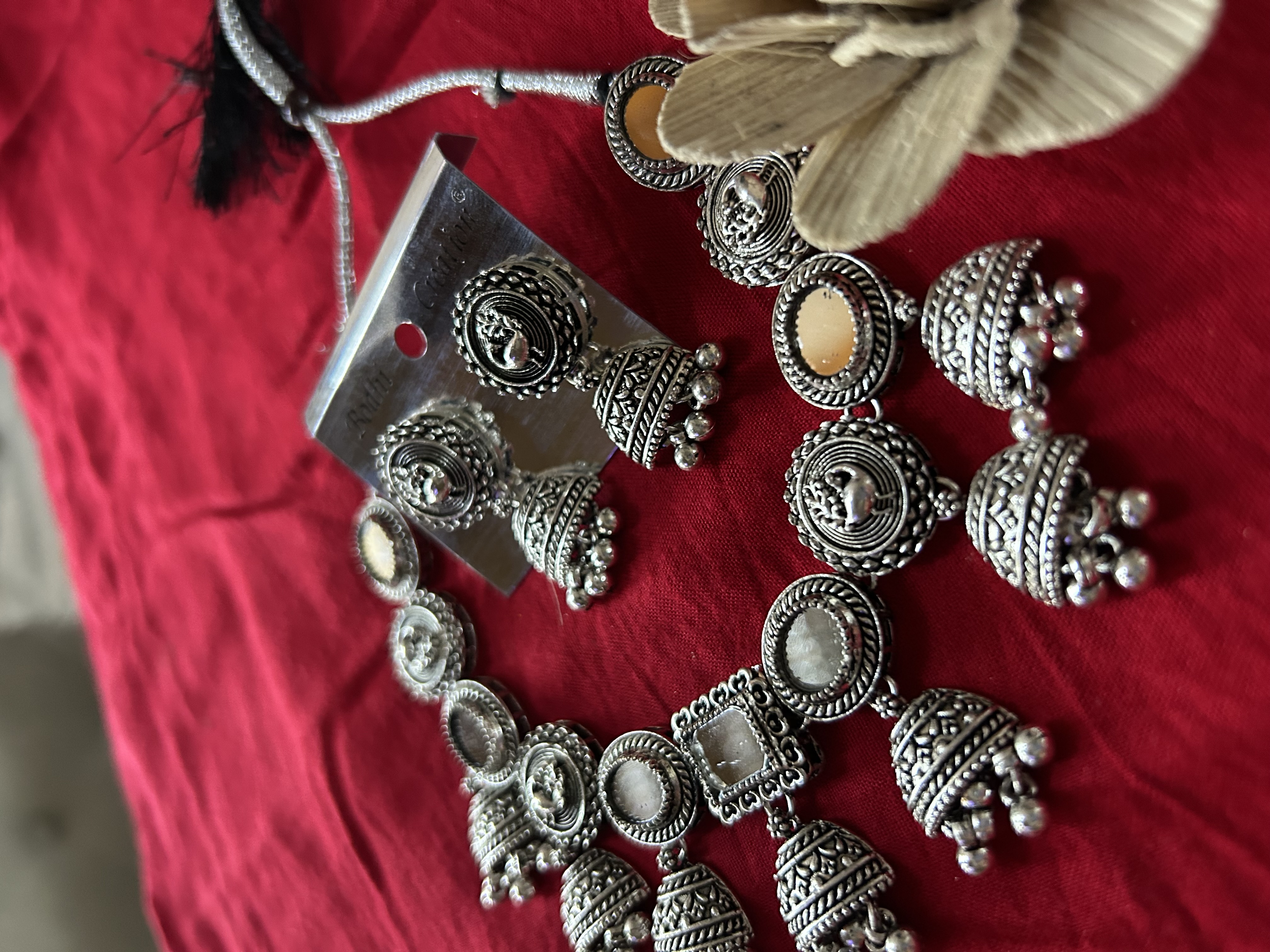 This exquisite oxidized silver necklace set features a blend of traditional and contemporary craftsmanship. The necklace is embellished with circular and square mirror accents, adding a unique shimmer to the intricate oxidized silver base. The dangling jhumka bells enhance the traditional charm, making it perfect for festive occasions, weddings, and cultural events. The set is accompanied by beautifully detailed jhumka earrings with matching patterns to complete the look.