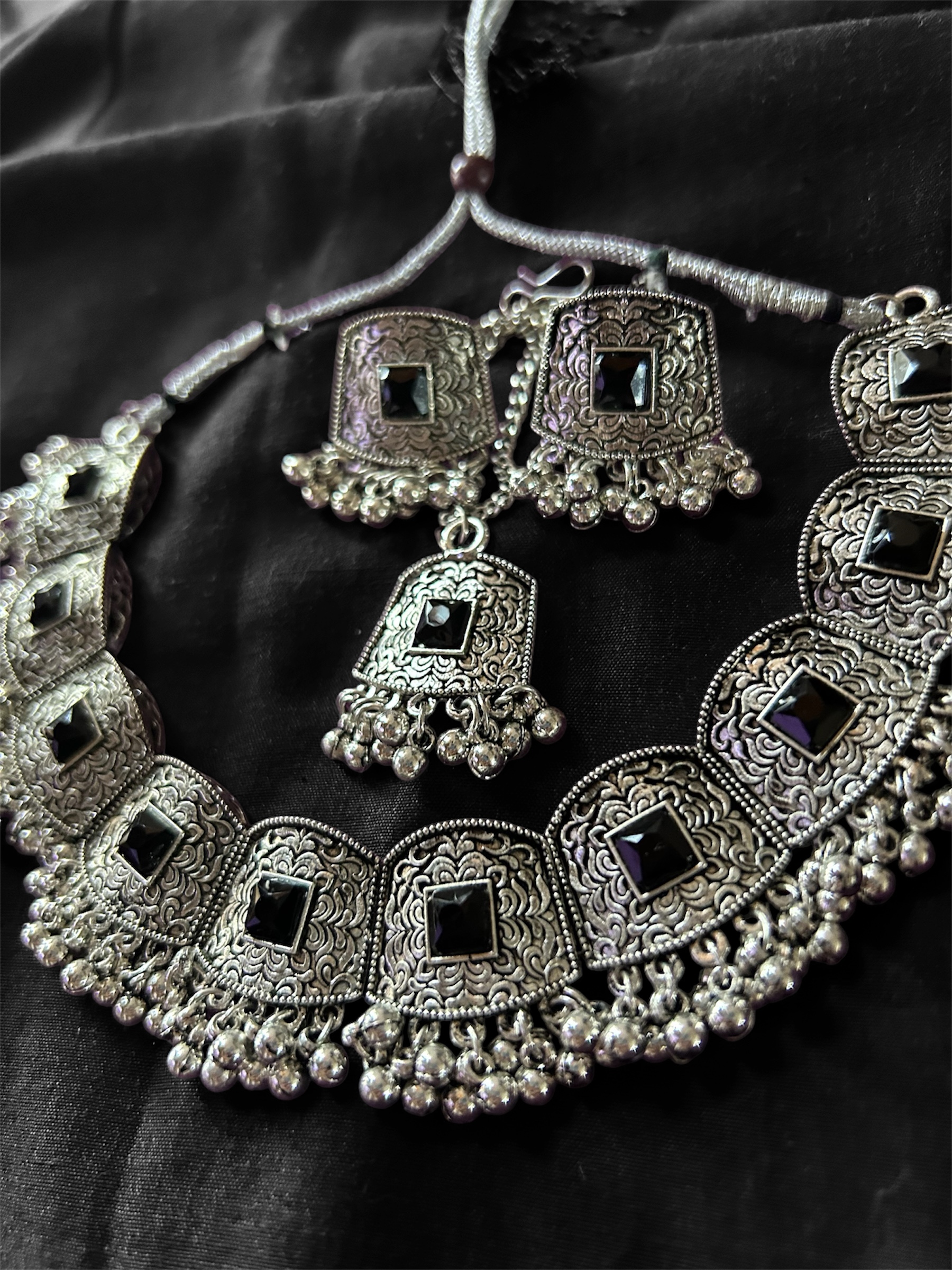 This beautiful oxidized silver necklace set showcases intricate handcrafted detailing with delicate engravings, enhanced by striking black stone embellishments that add a bold contrast to the antique silver finish. The necklace features dangling silver beads that create a graceful, traditional look. Paired with matching jhumka earrings that reflect the same design, this set is an ideal choice for weddings, festive occasions, and traditional celebrations.