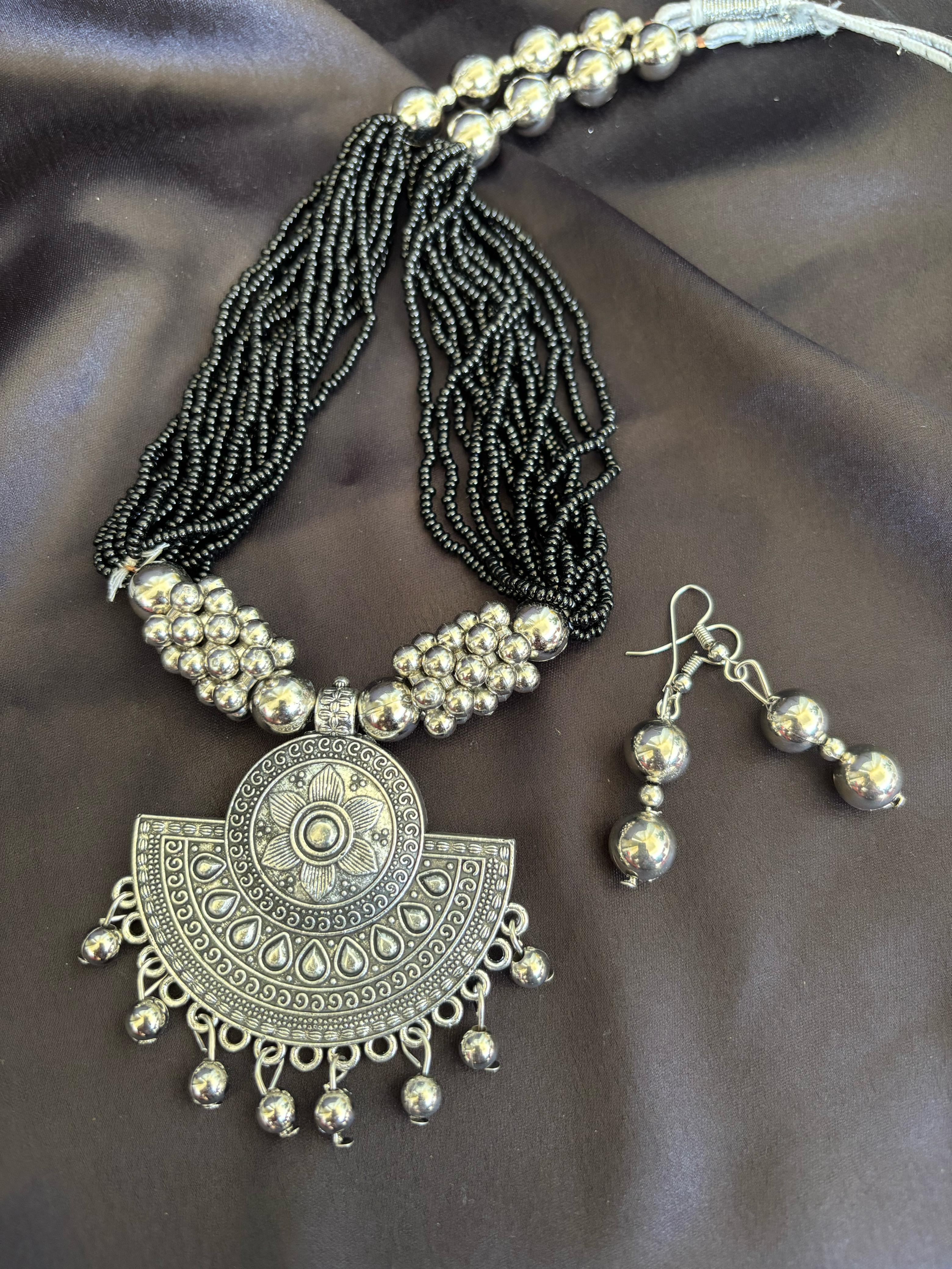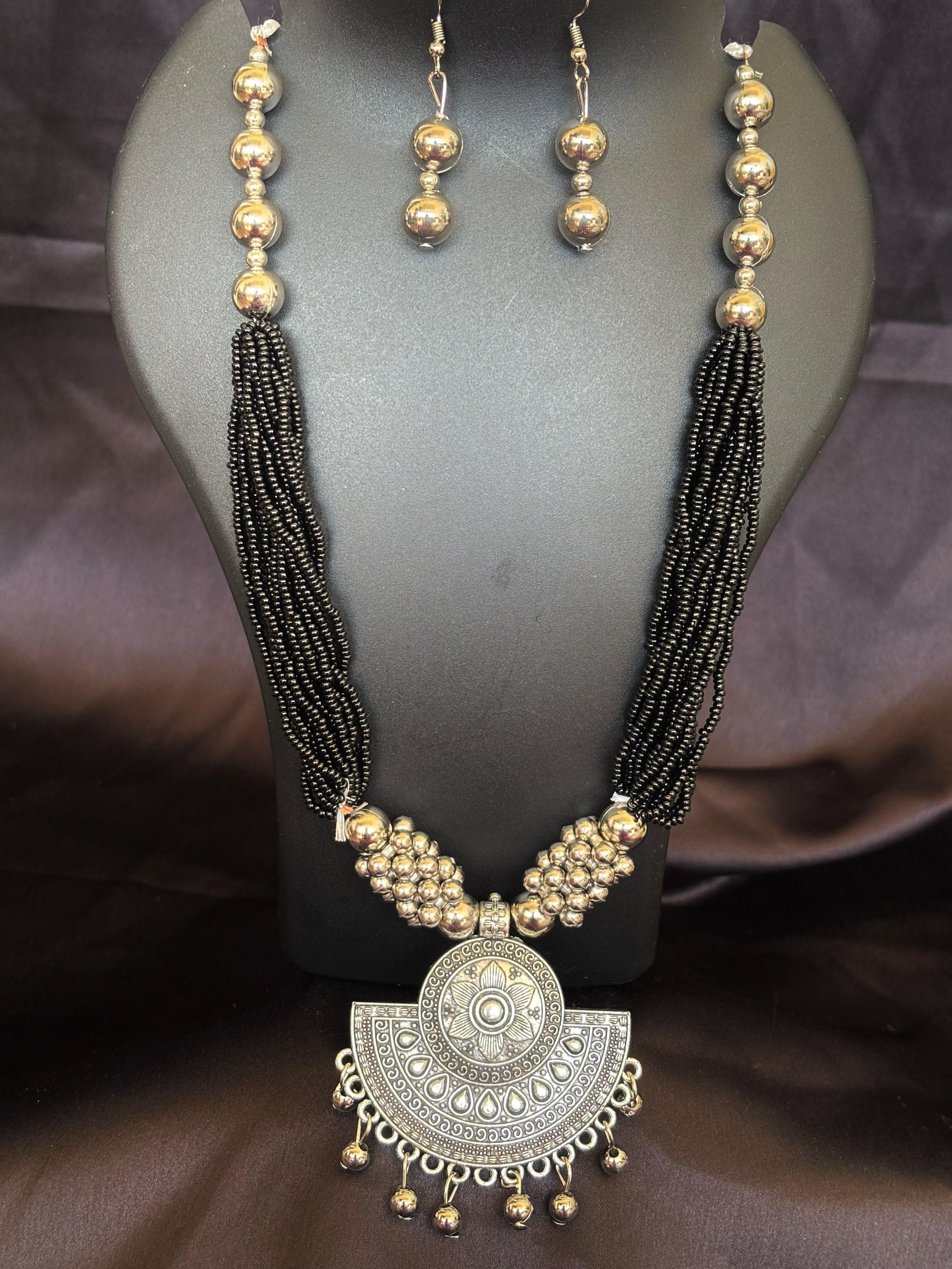Add a touch of elegance to your jewelry collection with this beautifully crafted oxidized silver necklace set. The necklace features multiple strands of fine black beads that elegantly complement the antique-finish silver beads and a delicately designed statement pendant with intricate patterns and dangling charms. The set comes with matching earrings adorned with silver beads, making it a perfect accessory for weddings, festive celebrations, and cultural events.