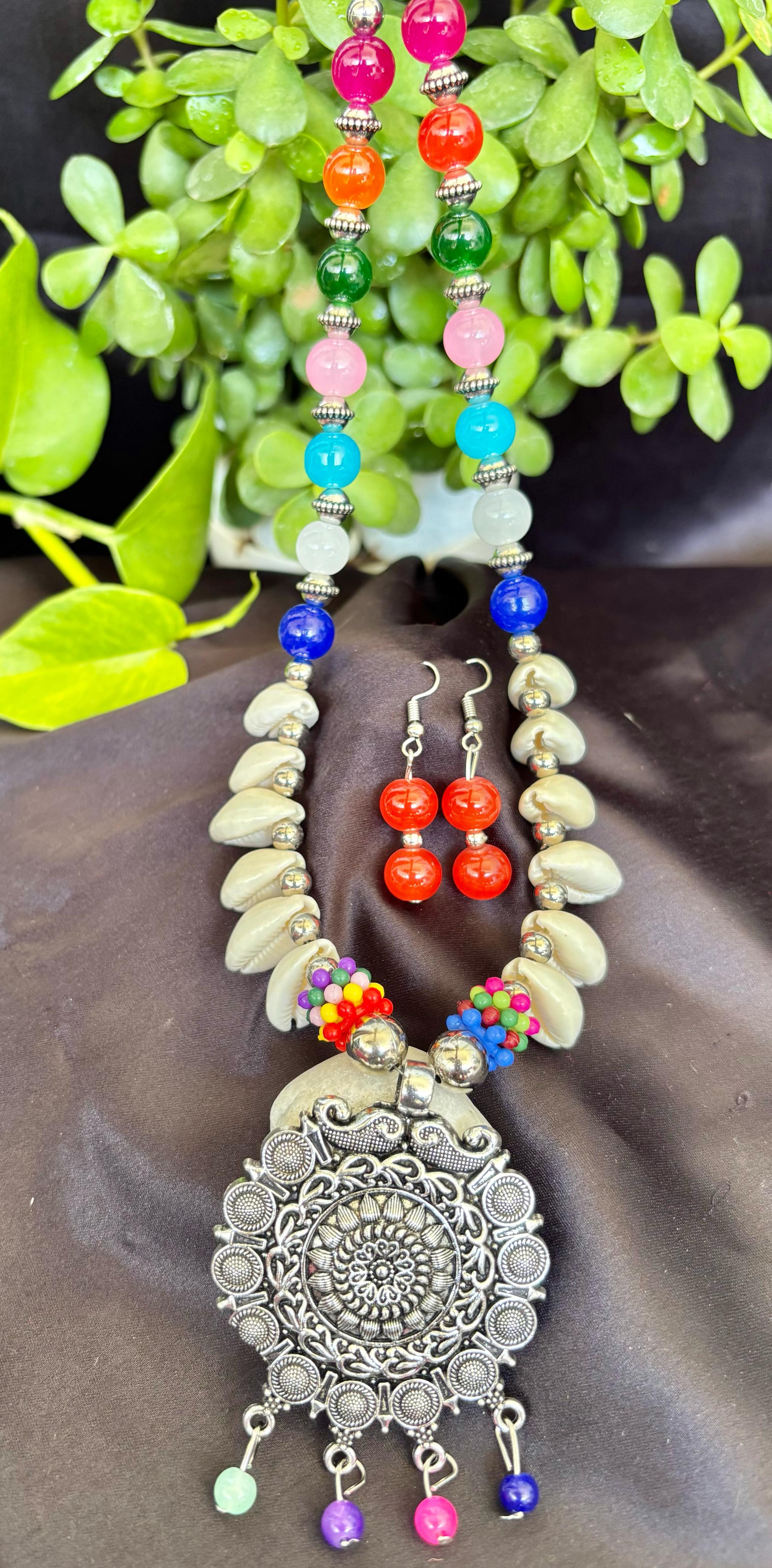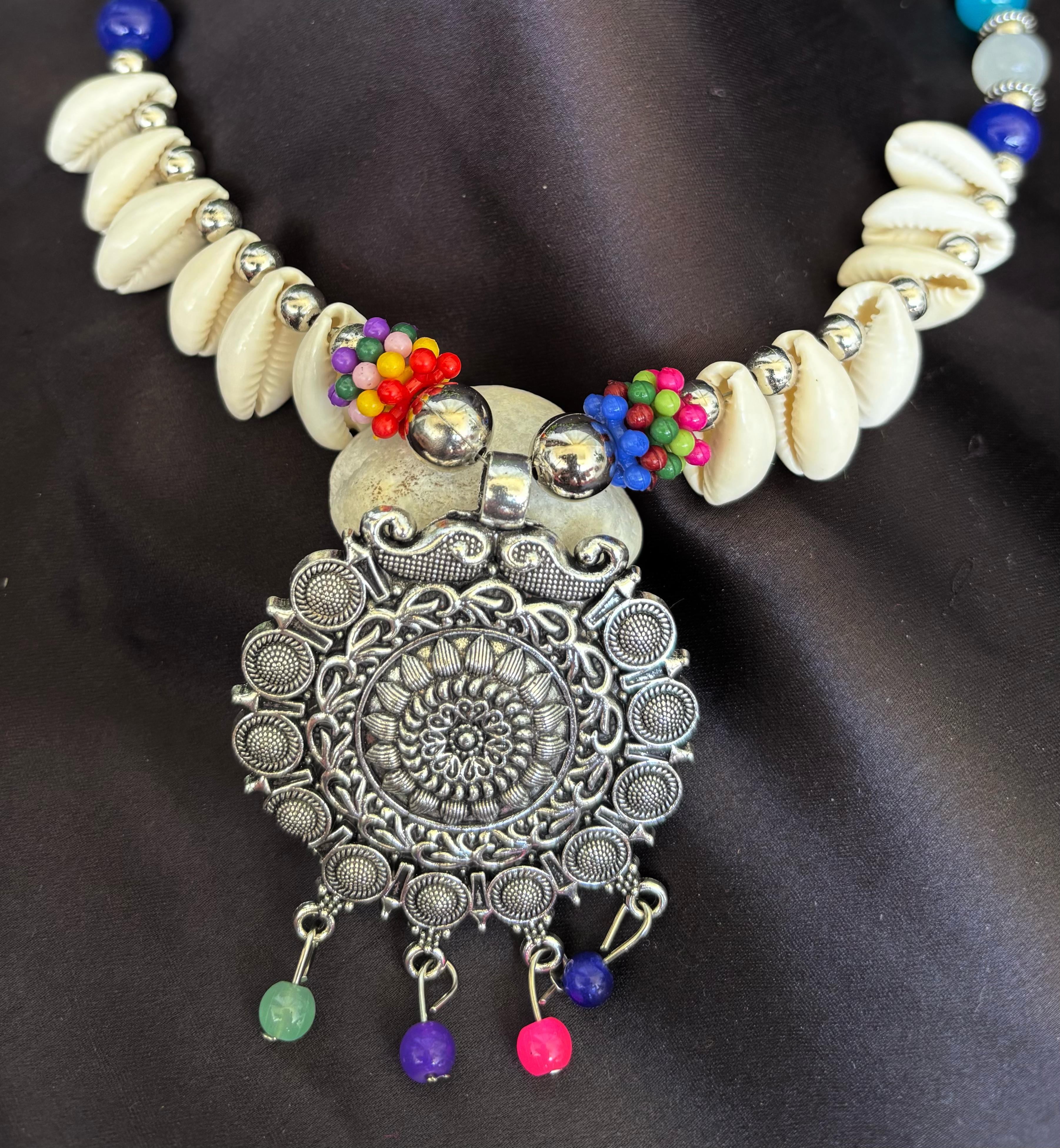 This handcrafted oxidized silver necklace set is a must-have for lovers of ethnic and tribal jewelry. The striking combination of colorful beads, authentic cowrie shells, and a finely detailed oxidized silver pendant gives this set a bold yet elegant appeal. The pendant boasts intricate floral and geometric patterns, enhanced with tiny dangling beads for a playful touch.