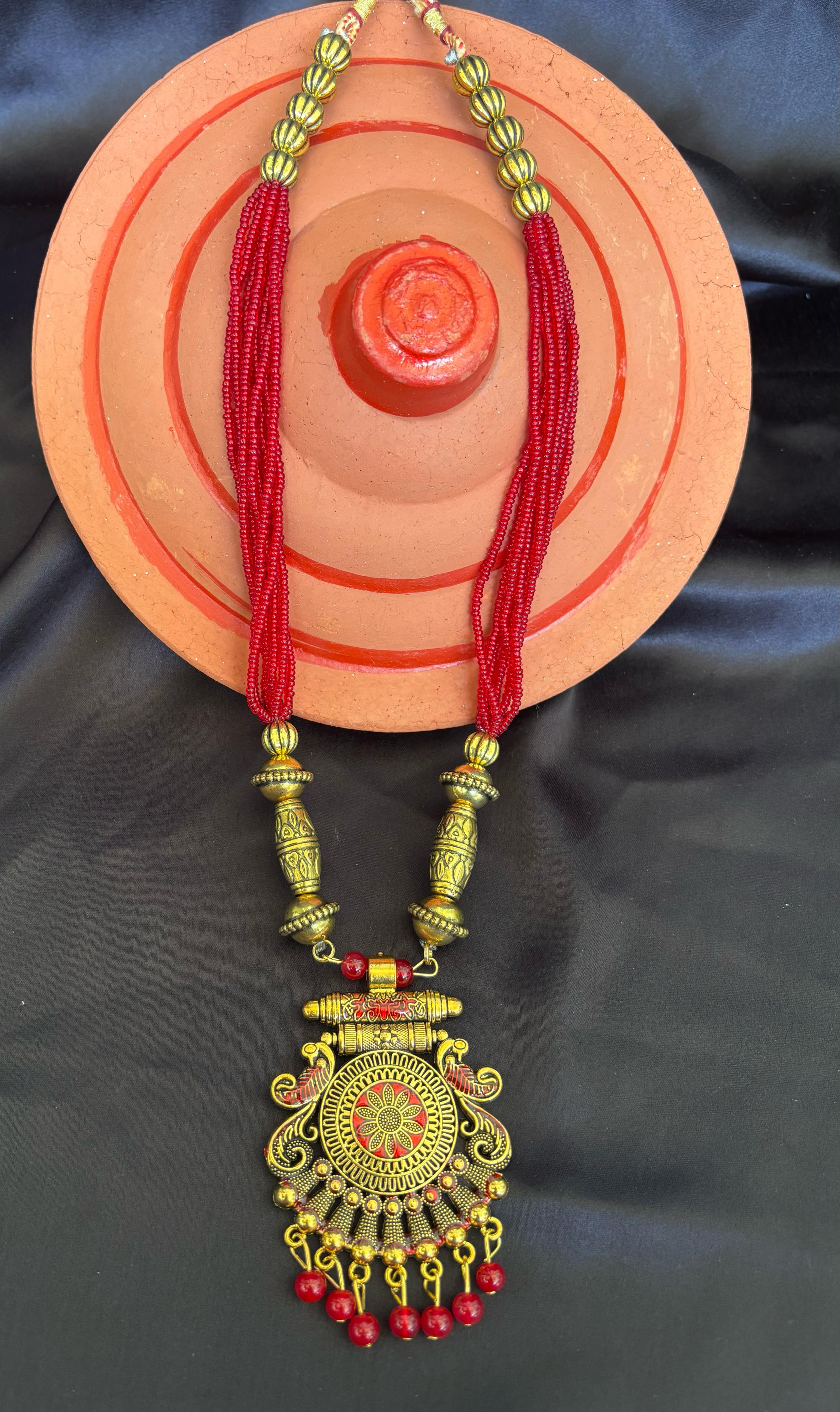 Add a touch of vintage charm to your ensemble with this stunning handcrafted necklace set. The necklace boasts vibrant red micro-bead strands that cascade gracefully, leading to antique gold cylindrical accents and a beautifully crafted circular pendant with floral and geometric designs. The pendant is adorned with delicate red bead hangings, enhancing its timeless appeal. Complemented by matching red bead drop earrings, this set is perfect for festive occasions, weddings, and cultural events.