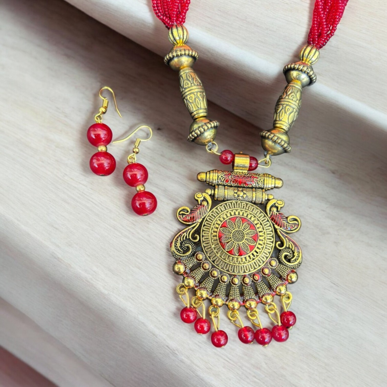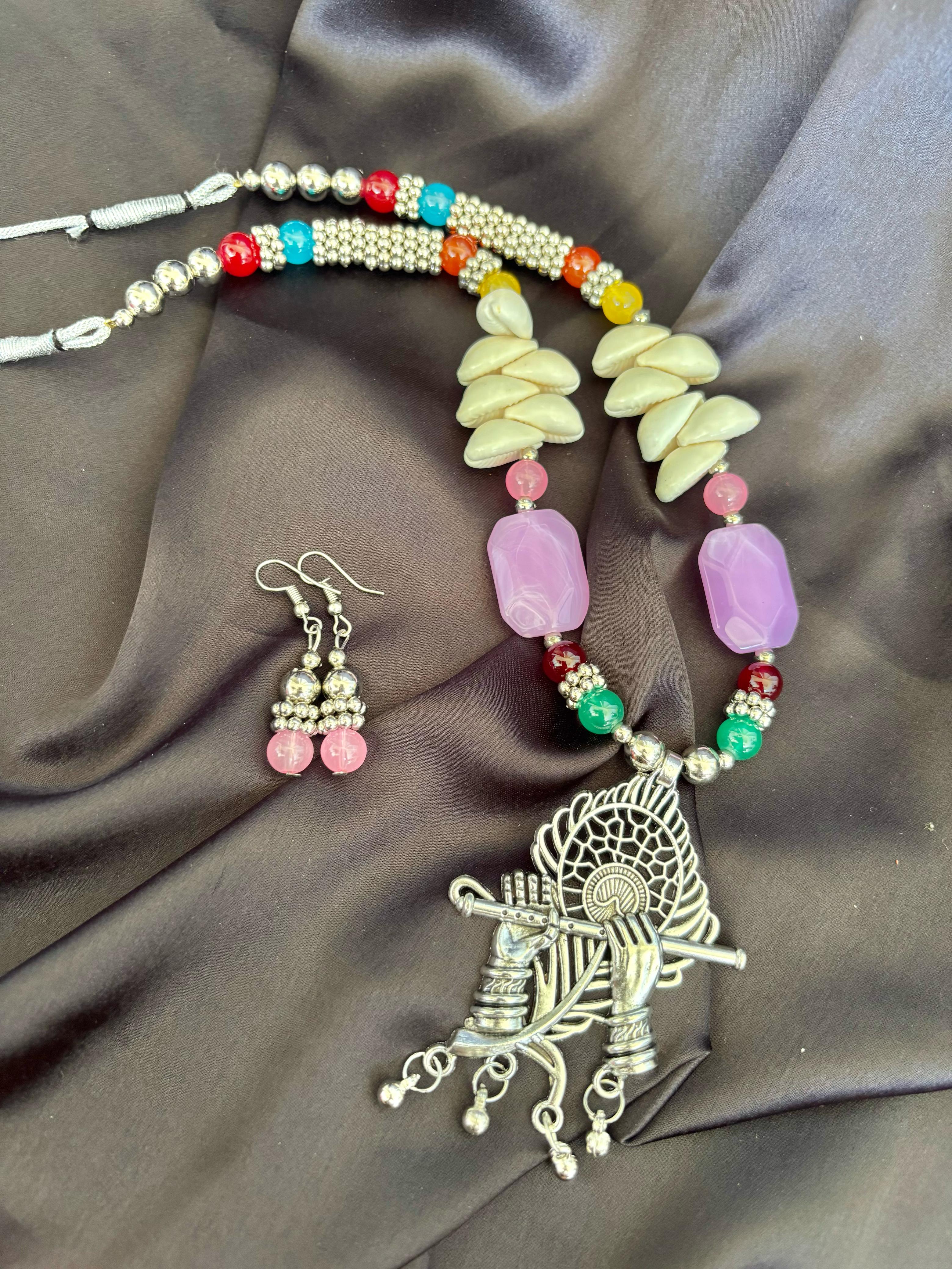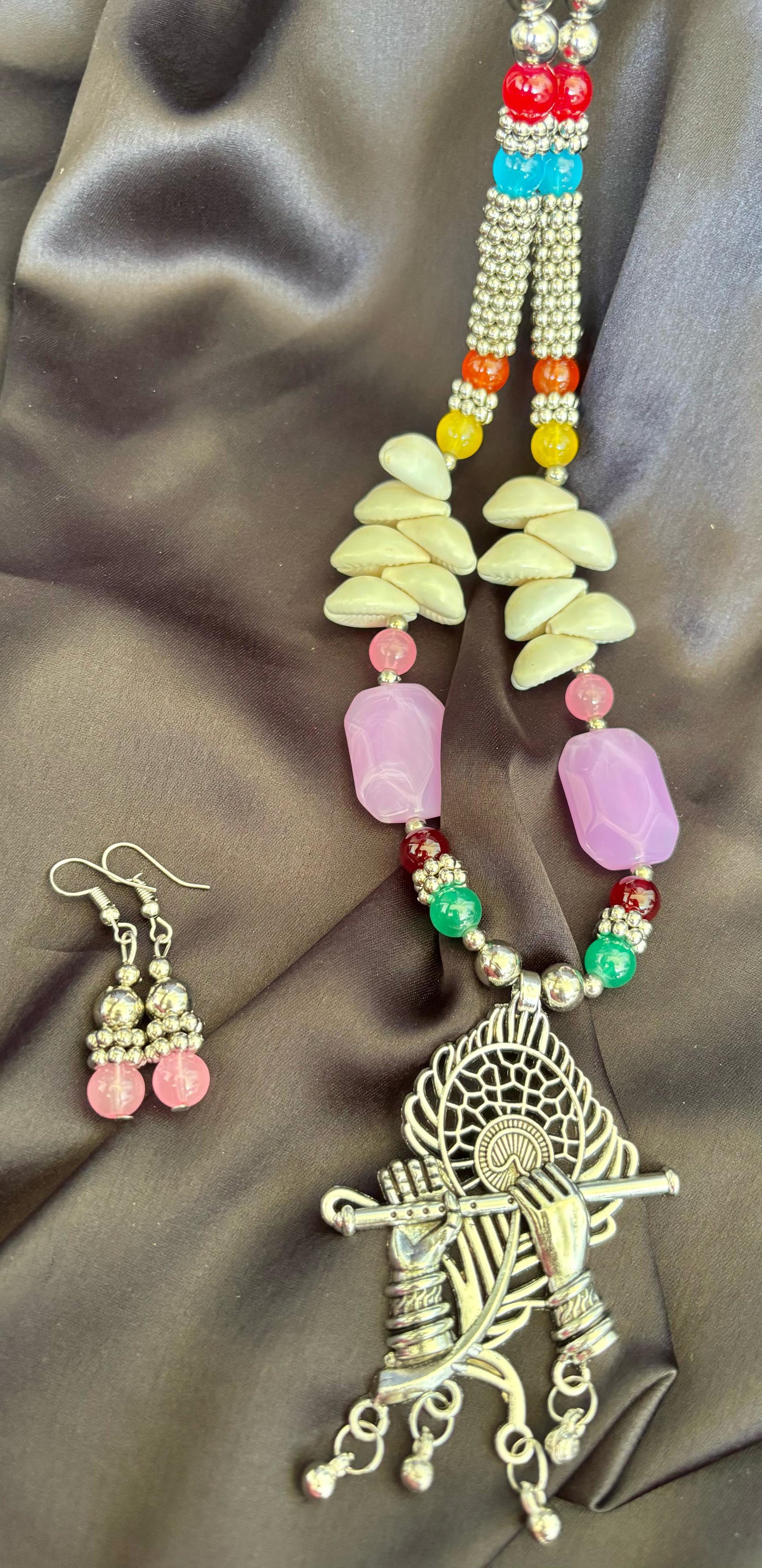 Infuse grace and tradition into your style with this handcrafted necklace showcasing a detailed silver pendant of Lord Krishna playing the flute, symbolizing divinity and devotion. The necklace is beautifully strung with multicolor beads, intricate golden beadwork, polished shell accents, and purple gemstone beads that add a pop of elegance. The set is completed with matching pink bead drop earrings, making it a perfect choice for festive occasions, weddings, and cultural celebrations.